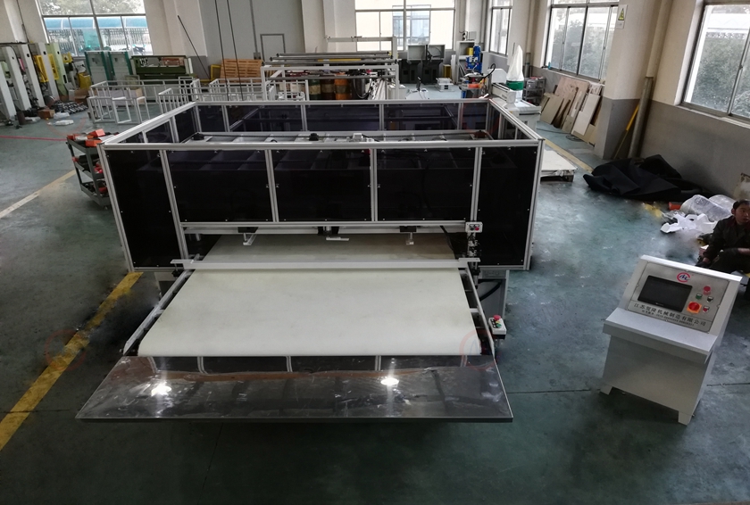 定制此机器的客户是用来裁切汽车无纺布后备箱垫的。适合发无纺布、泡材、纸板、纺织物、塑胶材料、皮革、橡胶、包装材料、地板材料、地毯、玻璃纤维、软木等材料之刀模裁断,适合各种产业的裁断作业。
